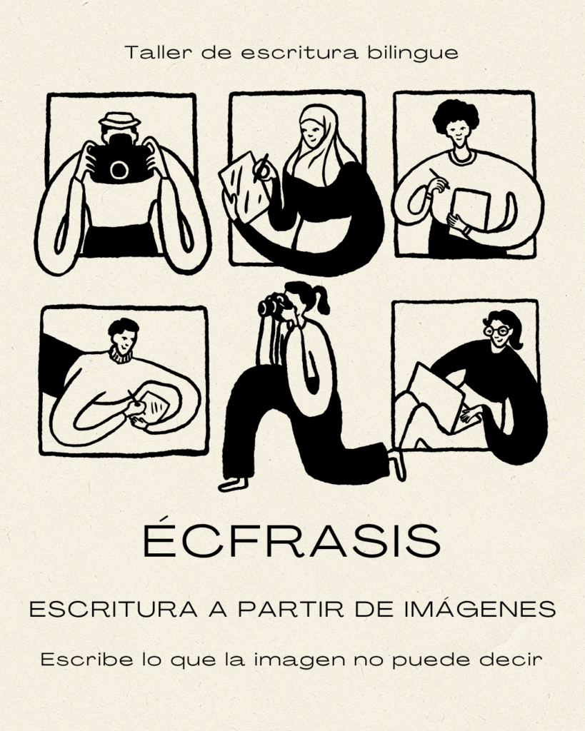 ÉCFRASIS: Escribir desde la imagen — taller bilingüe de escritura generativa con Mariana Graciano. Explora la escritura a partir de fotos, pinturas, esculturas, collages y objetos personales.