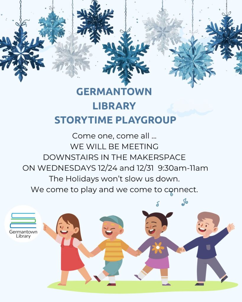The Germantown Library Storytime Playgroup will be meeting downstairs in the Makerspace on Wednesday, 12/24 & 12/31, 9:30-11am