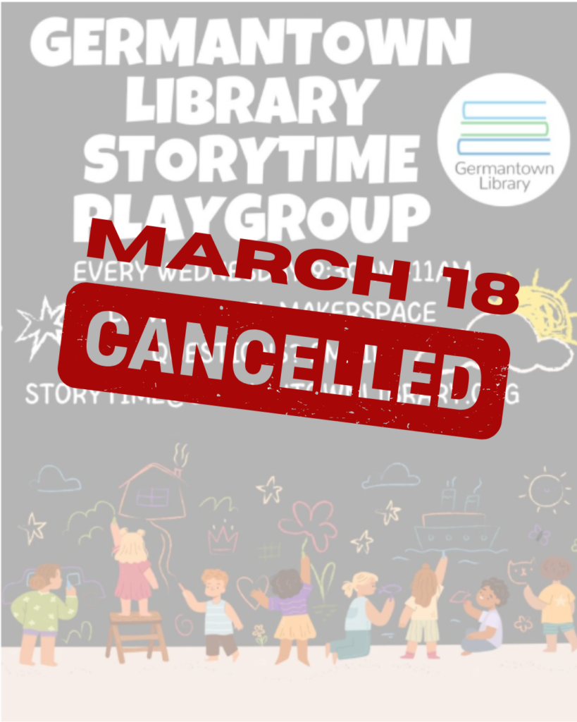 The Wednesday, March 19th Storytime & Playgroup has been cancelled. Regular hours will start again on March 25th.